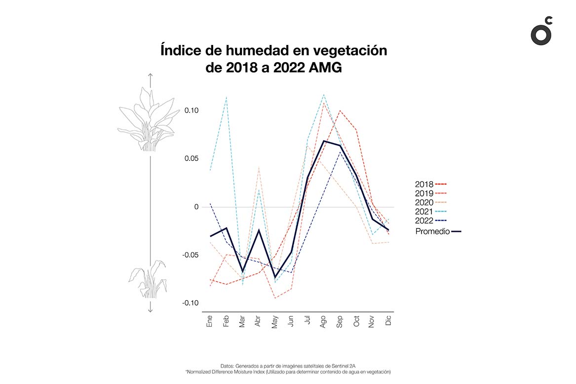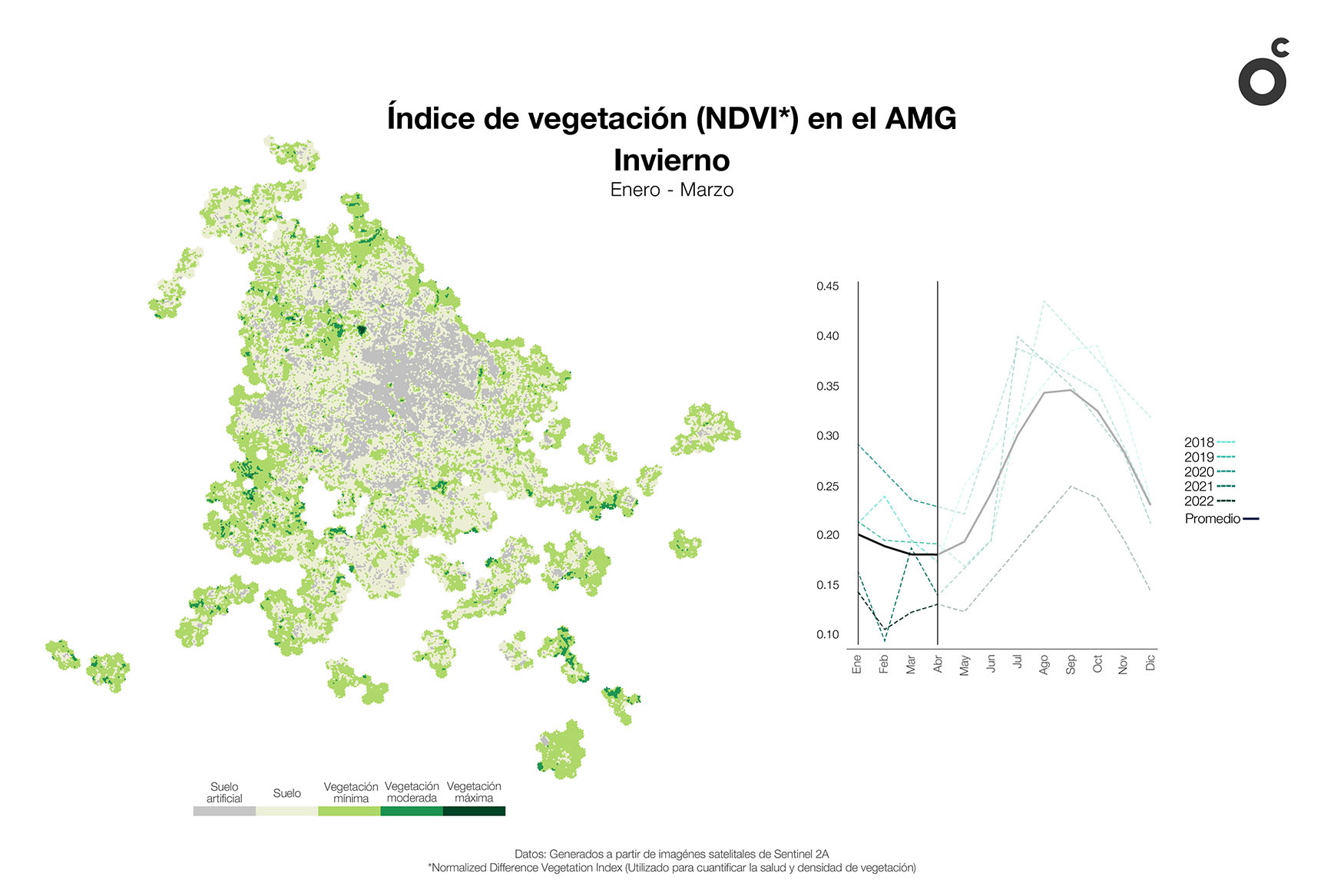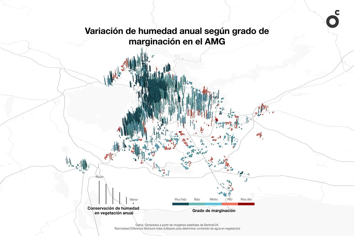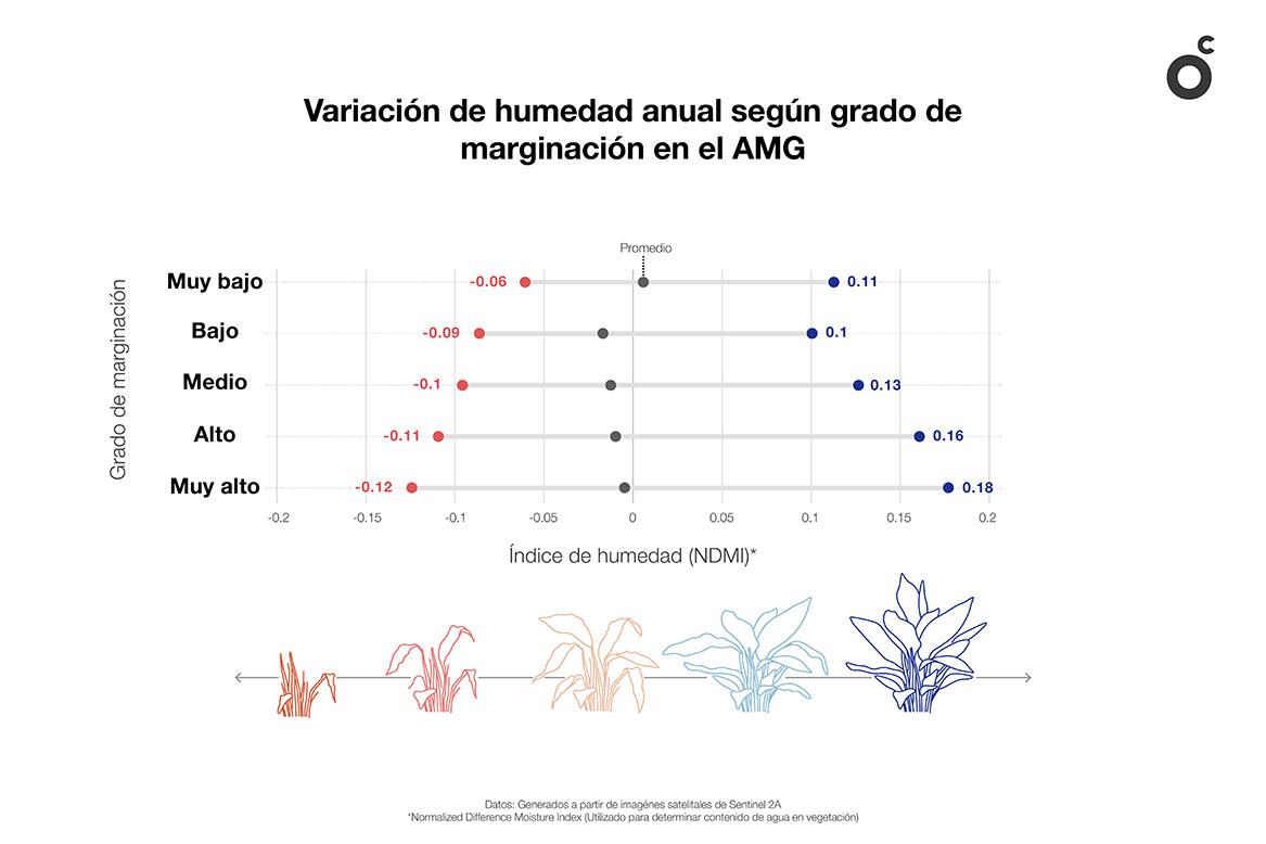Utilizando información satelital realizamos un análisis para entender dónde se concentra la vegetación y cómo se comporta durante el año en Guadalajara. Cruzamos información sobre vegetación y humedad con el índice de marginación para identificar patrones en la distribución de estas áreas verdes tan vitales para la habitabilidad urbana.