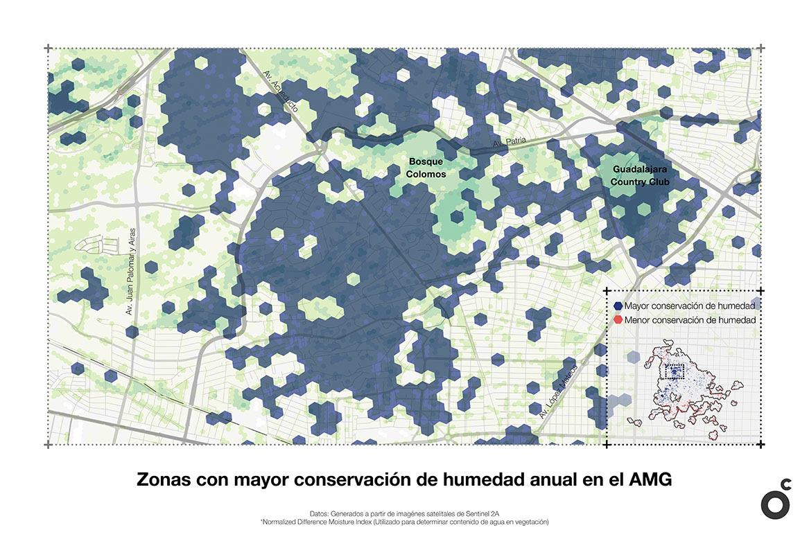 Utilizando una rejilla hexagonal sobre la ciudad, se comparó el índice de marginación del Consejo Nacional de Población (CONAPO) con el comportamiento estacional de la vegetación y la humedad, resaltando que los hexágonos que mantienen altos niveles de humedad durante la temporada de sequía se concentran en las zonas de bajo grado de marginación, y aquellos con mayor variación anual se concentran en las periferias (alto grado de marginación).