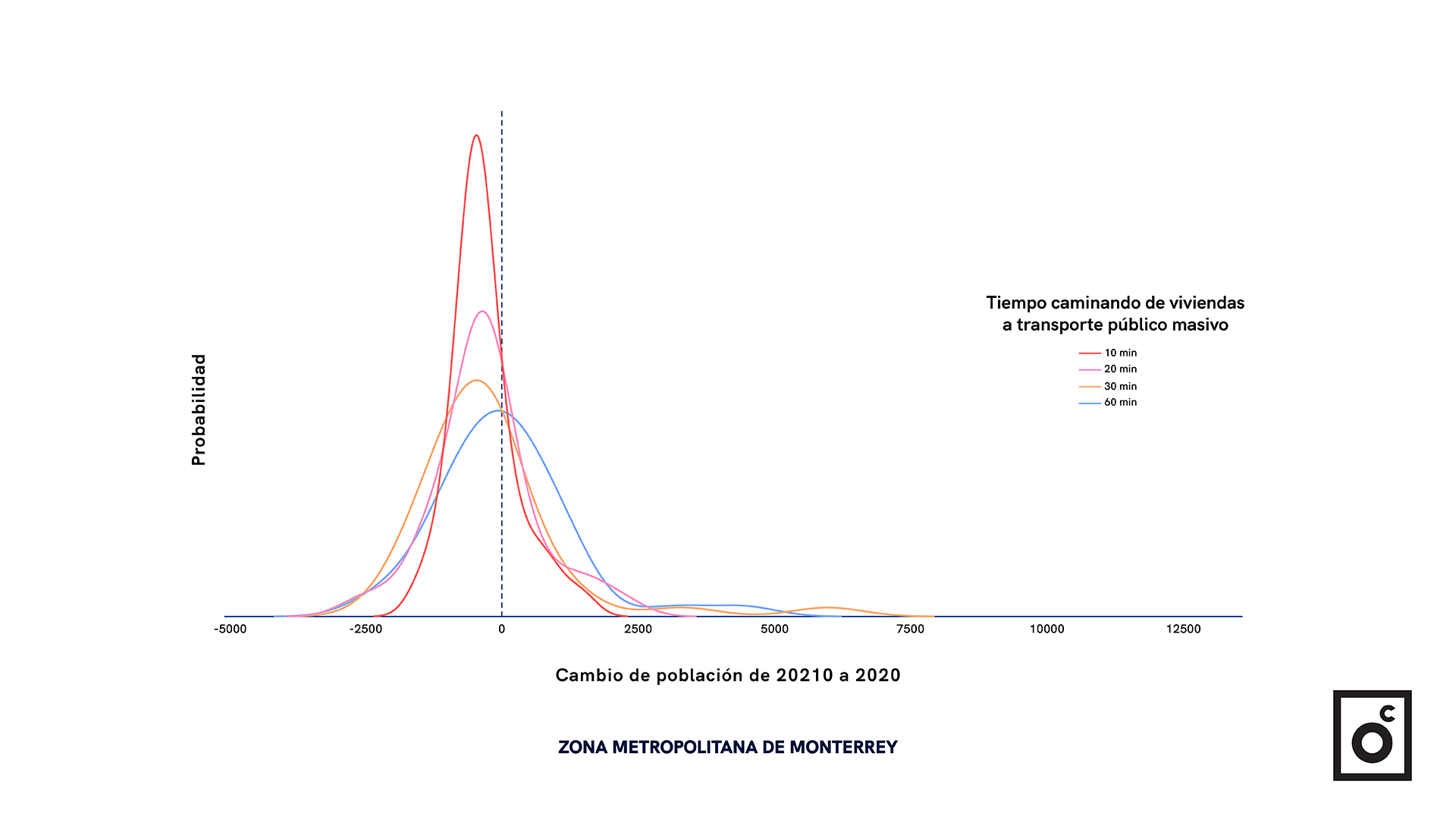 Esta visualización muestra la distribución probabilística del cambio poblacional para todas las zonas estudiadas, según su distancia al transporte público. Estos datos provienen de los Censos de Población y Vivienda 2010 y 2020.