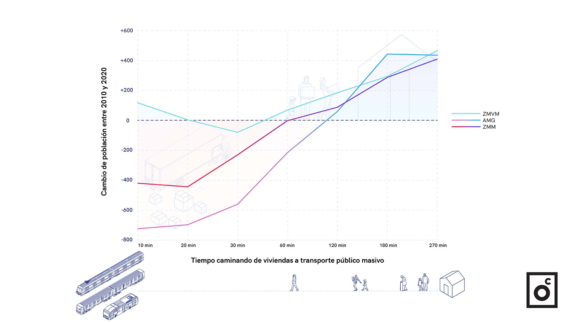 Lo que encontramos es que existe una correlación: las zonas más cercanas al transporte público masivo son las que más han perdido población. En general, las viviendas a 60 minutos o menos caminando de las estaciones de transporte público masivo perdieron población, pero las que más perdieron fueron aquellas a aproximadamente 20 minutos.