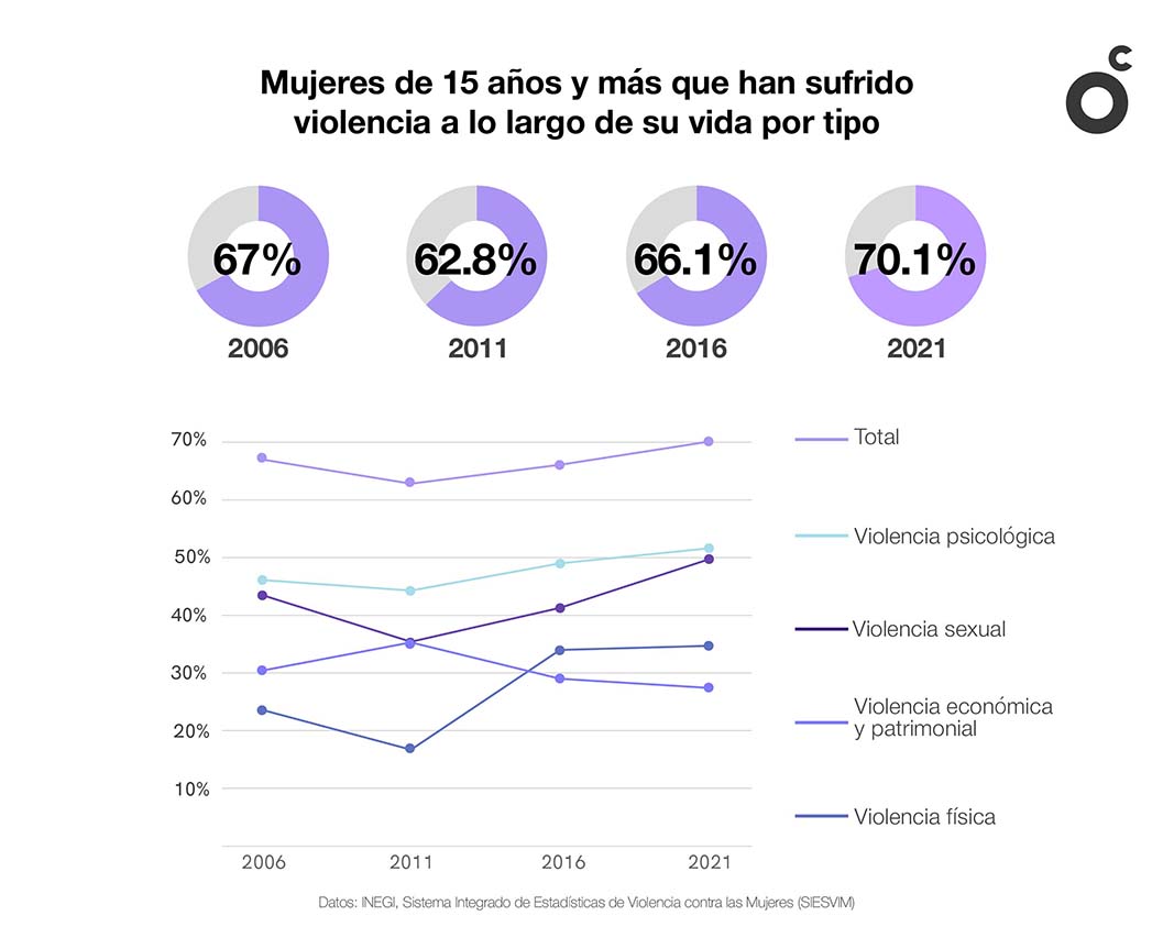 Una tendencia clave, identificada en las bases de datos ENDIREH y SIESVIM de @INEGI_INFORMA, es el aumento de la violencia basada en género en todas sus vertientes: sexual, económica y patrimonial, física y psicológica.