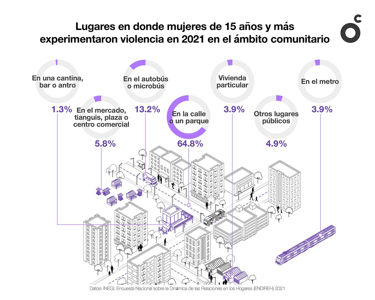 Aunque la violencia dentro del hogar es prevalente, las mujeres mencionan que la calle, los parques y el transporte son los lugares donde enfrentan violencia más frecuentemente. Esto habla de que el espacio público sigue siendo construido como hostil contra las mujeres.