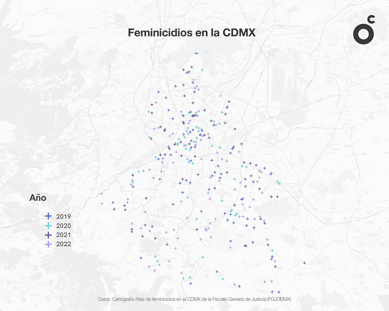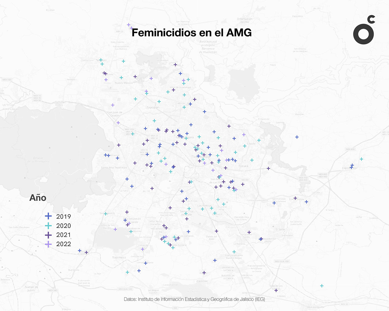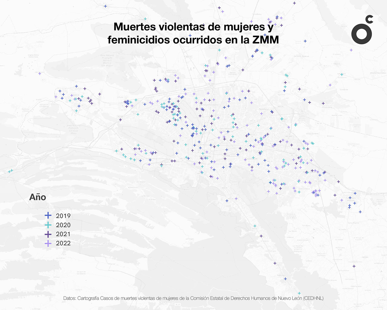 Con datos del IIEGJ, la CEDHNL, y la Fiscalia CDMX, es posible visualizar la ubicación de aquellos casos reconocidos como feminicidios por las autoridades de Jalisco y Ciudad de México y como muertes violentas de mujeres por las autoridades de Nuevo León.