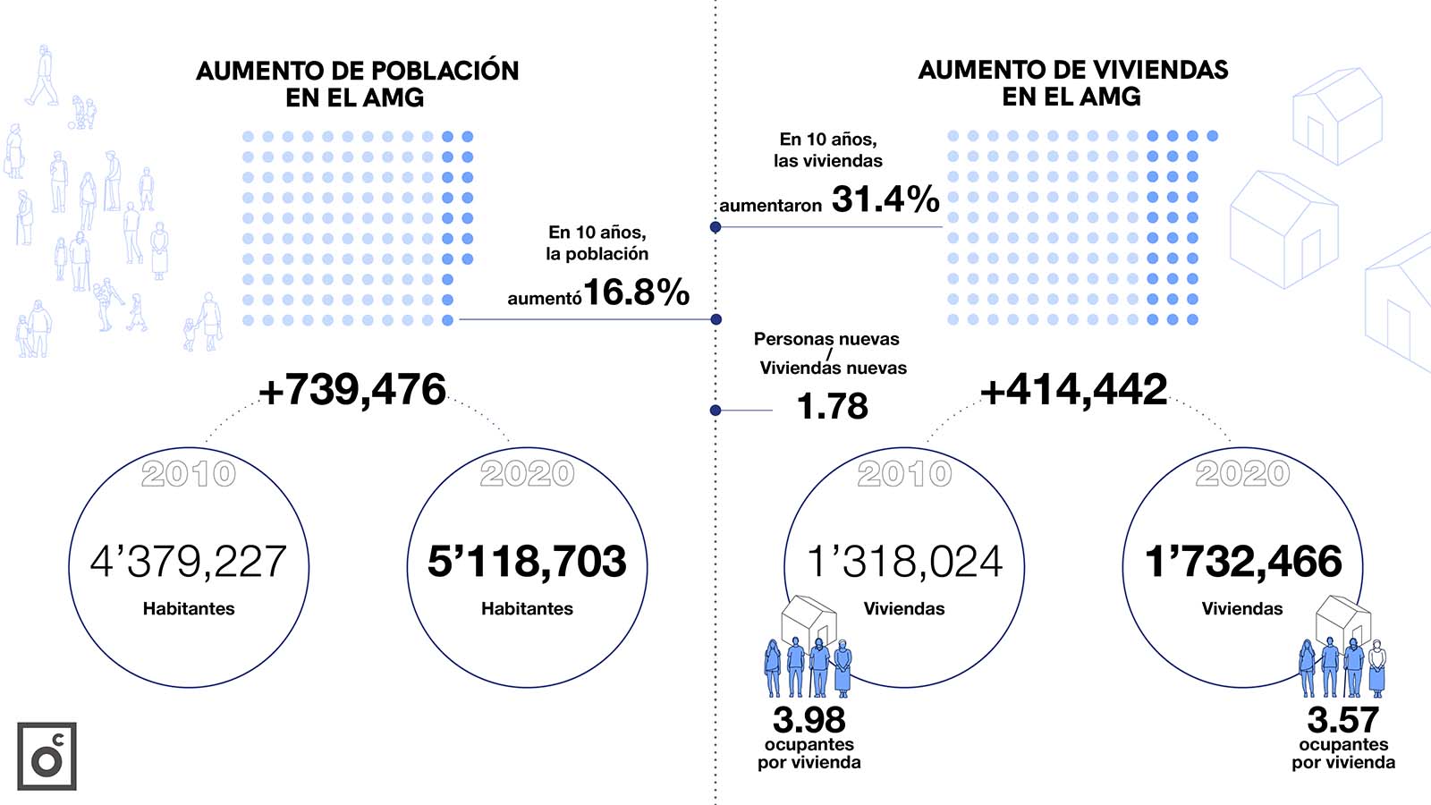 Entre 2010 y 2020, dentro del AMG se construyó una vivienda nueva por cada 1.78 habitantes nuevos, lo que representaría una sobre oferta, si consideramos que el promedio de ocupantes es de 3.5 personas por vivienda, según el censo poblacional más reciente.