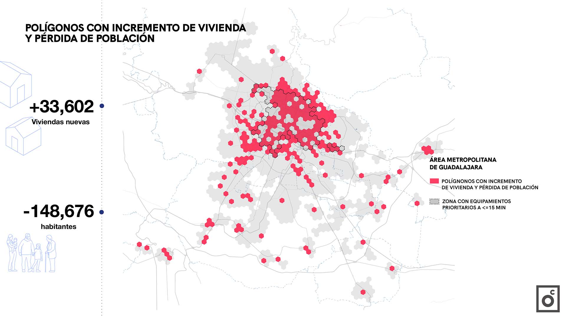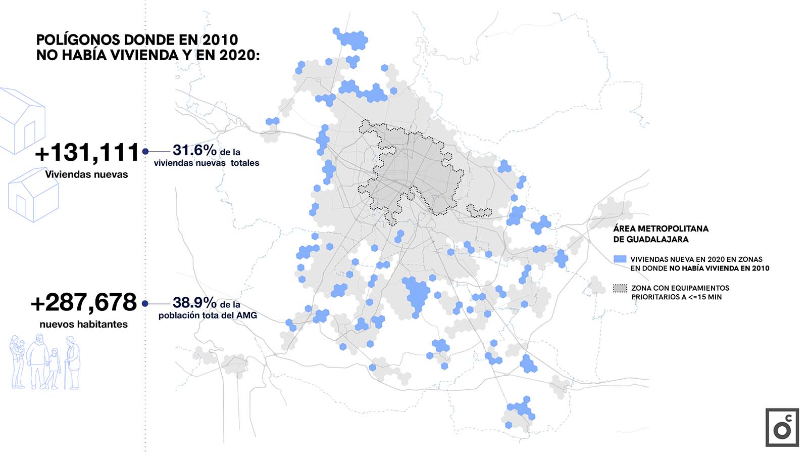 Se encontró que entre 2010 y 2020 se construyeron miles de viviendas en toda el Área Metropolitana de Guadalajara (AMG), sin embargo, resaltan zonas que a pesar de haber incrementado el número de viviendas, han perdido población con respecto al censo anterior. Este fenómeno se concentra en las zonas más consolidadas, es decir, que cuentan con mejor cobertura de servicios y, por lo tanto, pueden ofrecer una mejor calidad de vida a sus habitantes.