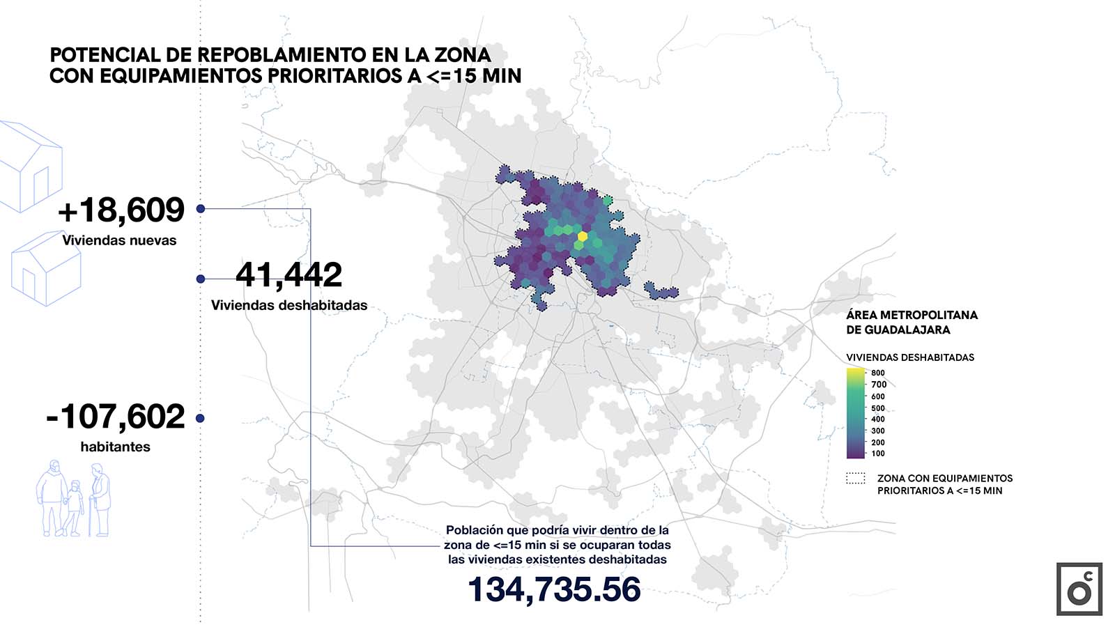 En el área delimitada de la ciudad de 15 minutos, según el censo de 2020, existen 41,442 viviendas deshabitadas, entre 2010 y 2020 se construyeron 18,609 viviendas adicionales, y el flujo poblacional neto en ese mismo periodo presentó una pérdida de 107,602 habitantes.